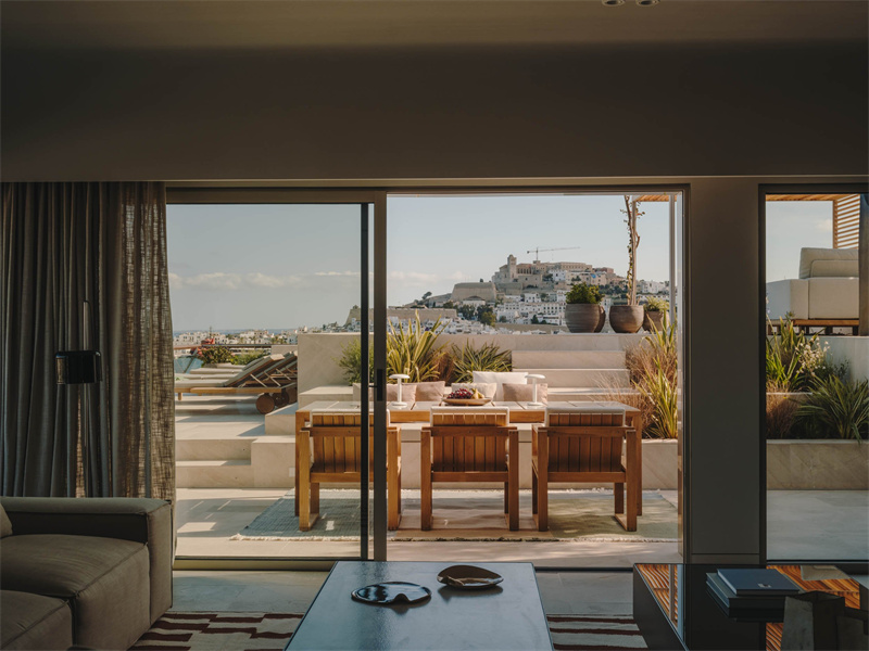 客廳和餐廳都面向露臺和 Dalt Vila。 房間寬敞,Sandra Tarruella、Blanca Comín 和 Nuria Martinez 團隊能夠設計出完美融合的定制作品,同時保持平衡的比例,營造出自然的地中海寧靜奢華氛圍。 我們還結合了專為該項目設計的家具,例如搪瓷熔巖桌或黃銅鏡面迷你吧臺,并包括標志性設計,例如 Fredericia 的西班牙椅。 這些元素與橡木覆蓋的墻壁形成和諧的對比。
