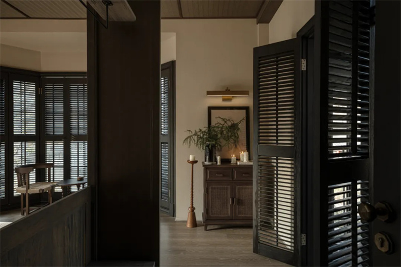 轉(zhuǎn)入樓梯,進(jìn)入空間更深處。當(dāng)暗與陰翳成為空間語境,空間更幽微、更濃郁、更具感染力的一面,才漸漸顯露出來。當(dāng)日光穿過百葉窗,將傾斜的條狀陰影投射在腳邊時,空間變得靈動而輕快,仿若有了呼吸與生命,以不可言說的方式引發(fā)著人內(nèi)心深處的共鳴。