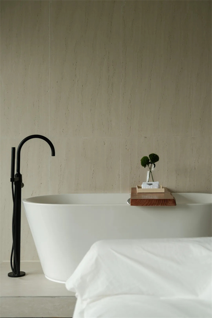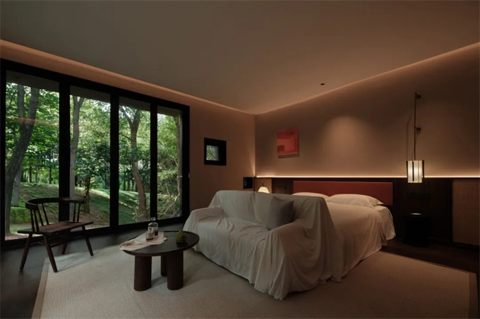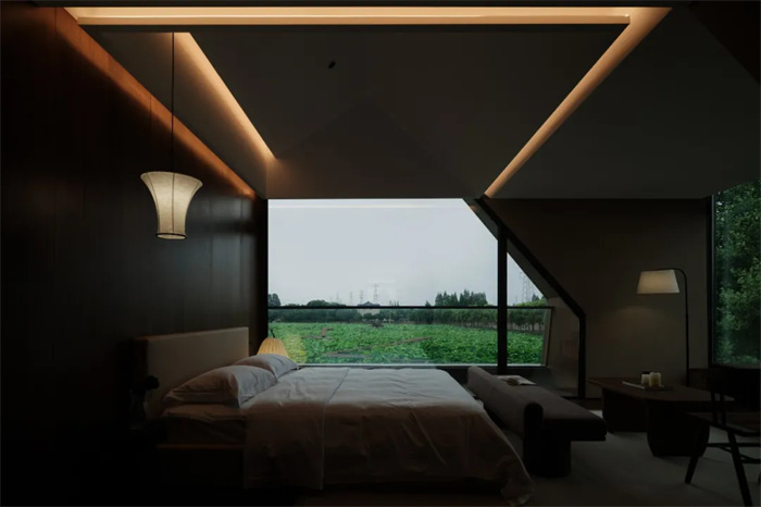 在墻面上巧妙地開設(shè)天窗,悄然引領(lǐng)著戶外那無垠的自然景致與瞬息萬變的光影,溫柔地滲透至室內(nèi)。借景自然的光影,在另一側(cè)墻面形成細(xì)膩而獨(dú)特的風(fēng)景畫,仿佛是室內(nèi)與外界之間搭建起了一座隱形的橋梁,讓兩者在光影的交織中相互滲透、相互融合。大面積窗戶鑲嵌于套房之中,以“開窗放入大江來”的豪情,讓窗外荷花塘的綠意與清風(fēng)無拘無束地穿梭,使人得以更緊密地?fù)肀н@份寧靜與自由。