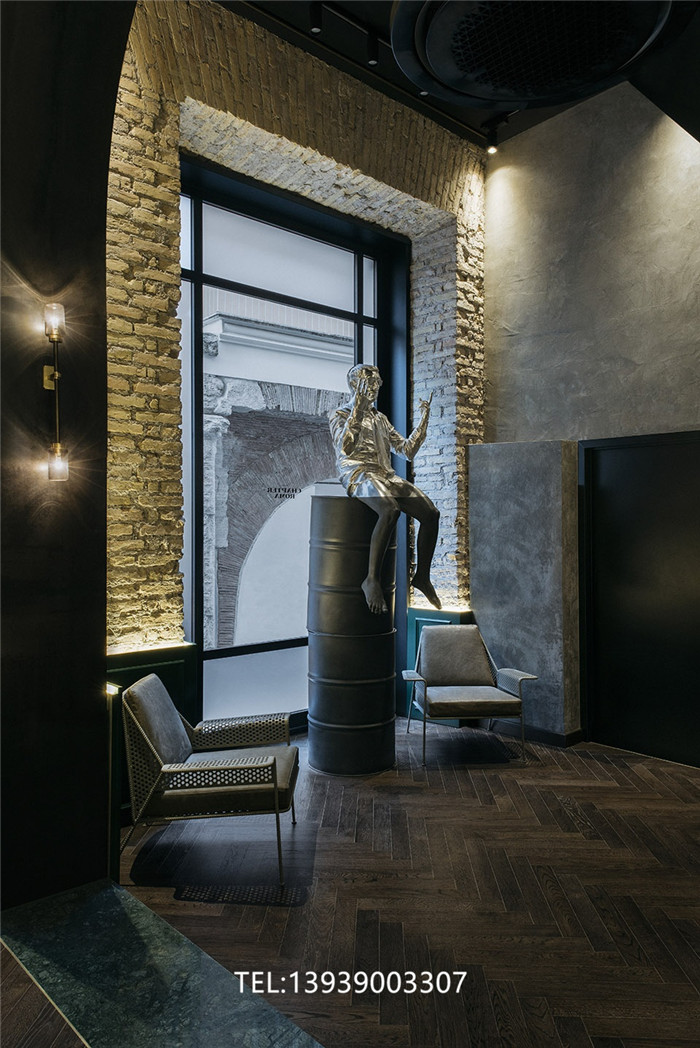 酒店的室內(nèi)設(shè)計由來自約翰尼斯堡(Johannesburg)的屢獲殊榮的設(shè)計師Tristan du Plessis負(fù)責(zé),在考慮Chapter Roma酒店的視覺設(shè)計時,他參考了Regola地區(qū)當(dāng)前的定位——一個正在蓬勃發(fā)展的藝術(shù)中心、以及其歷史——一片工業(yè)鍛冶工作的場地等兩方面的因素。建筑師對原建筑的結(jié)構(gòu)體系進行了修復(fù)和翻新,而新古典主義的主題元素如高大的室內(nèi)拱門和拱形天花板等,現(xiàn)在則與裸露磚墻和金屬裝飾等工業(yè)風(fēng)格的美學(xué)特征交相輝映,營造出一種醒目的視覺效果。