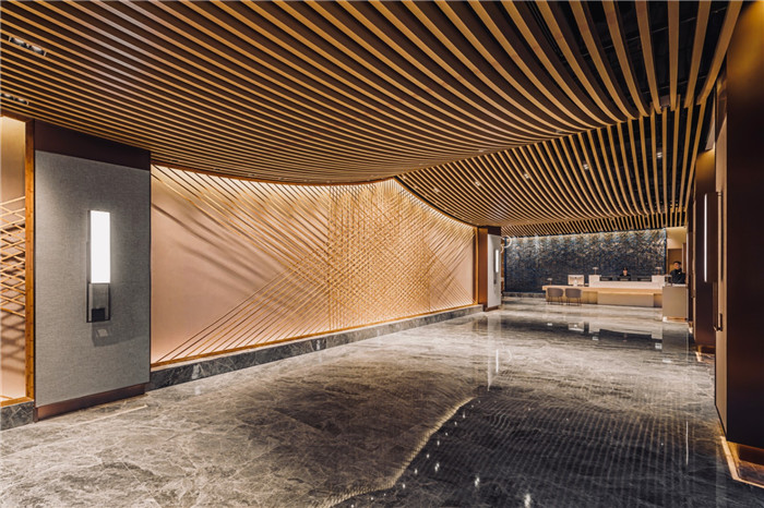 從酒店大堂空間開始, 竹子作為主要的材料讓每一個顧客進到大堂空間第一眼就看到主題。 我們跟湖南的竹編師傅共同在現(xiàn)場探討怎樣可以利用竹編創(chuàng)造接待處及大堂吧的全高屏風(fēng), 尖頂天花及硅藻泥飾面墻體加以細致的光影效果成為整個空間的靈魂。