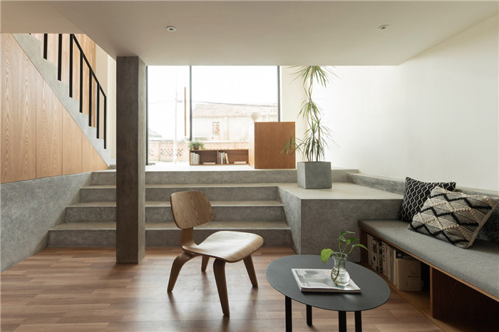在民宿客房部分,設(shè)計師希望營造出樸素溫暖的氛圍以及材質(zhì)的整體性效果,因此采用了地臺和功能家具相結(jié)合的形式,水曲柳的紋理,溫潤質(zhì)樸,拉進人與人,人與空間的距離感。室內(nèi)原始磚墻以及現(xiàn)澆混凝土結(jié)構(gòu)柱保留了原始的狀態(tài),呈現(xiàn)出粗獷野生的美感。木地板上墻,樓梯以及過道臺階整體無縫水磨石地坪,讓空間的延展上升性和連續(xù)性得以加強。