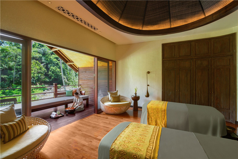 在這里客人可以面朝熱帶雨林做瑜伽;漫步于別墅間綠意盎然的小道;在Sawah Terrace還可以眺望采用傳統(tǒng)牛耕的稻田,孩子們難得在稻田內(nèi)玩耍;可惜享受稻田邊的專屬就餐體驗——阿漾河畔的Kubu餐廳包間,TheLibrary餐廳的下午茶。