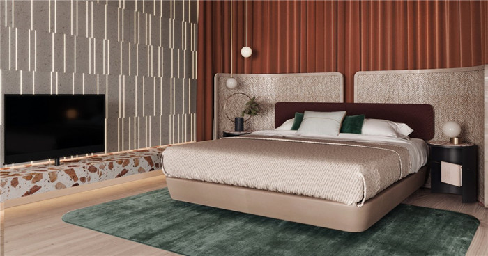 酒店客房設(shè)計(jì)延續(xù)酒店公區(qū)的設(shè)計(jì)風(fēng)格,不僅在色系上保持一致,金屬光澤的床品和弧形床頭造型將柔美與輕奢完美結(jié)合,十分驚艷!