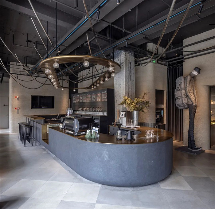 巨大的吧臺以黑色熱軋鋼板結(jié)合黃銅鍛造,頂面飄逸的弧形金屬管,隱喻船體與桅桿風帆的關(guān)系,迎風飄揚、逆風啟航。傳統(tǒng)酒店占據(jù)C位的接待前臺被規(guī)劃在一個獨立私密的區(qū)域,以“珠寶盒”的概念呈現(xiàn)于空間,結(jié)合在地城中創(chuàng)意人商品周邊的陳列售賣,宣示新潮高效的空間做派。