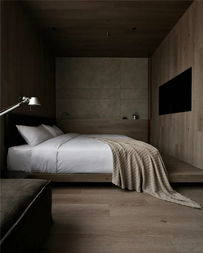 客房區(qū)的進入環(huán)道是心境的轉(zhuǎn)換之地,刻意壓暗的燈光、高挑的裸露屋頂、泛著金屬光澤的垂簾,營造宛如劇場的視覺空間。77間客房的空間規(guī)劃及布局以建筑的思考融入設(shè)計,房型命名也以建筑的專用名稱分類,共區(qū)分出Studio 室,Attics 閣, Yard 院,Station 站,Block 坊五種房型。
