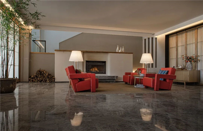 東方美學(xué)的陰翳之美也于天井四周體現(xiàn)。不同于光亮的天井,天井四周是暗調(diào)的、邊界不明確的,朱紅的中式落地?zé)粽樟劣邢薜姆秶?。讓視覺聚焦于天井內(nèi)。東方美學(xué)的內(nèi)斂與含蓄,正是空間氣質(zhì)所在。