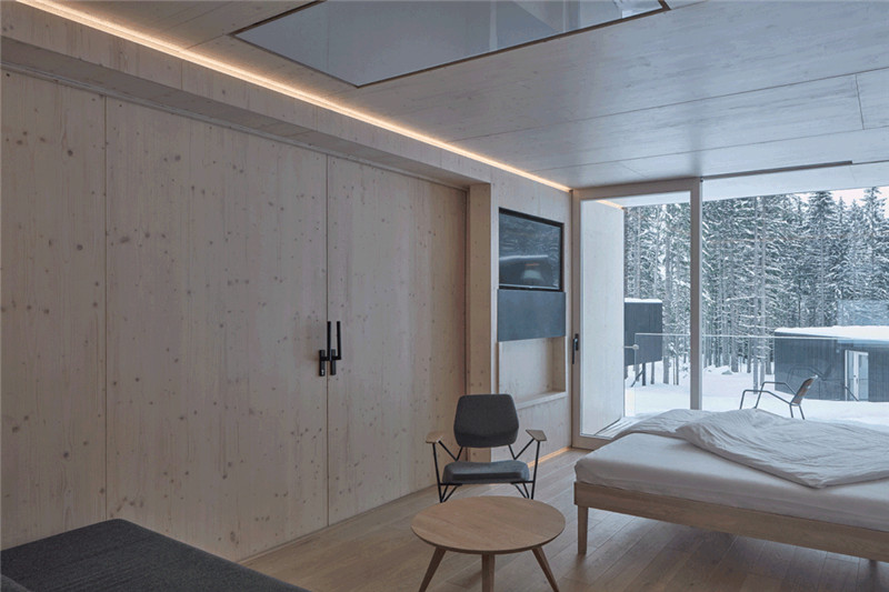 模塊的布局使旅客同時(shí)身處森林和Jasná滑雪勝地,并確保了它在酒店主體附近的隱私與寧靜。設(shè)計(jì)師還設(shè)計(jì)了酒店餐廳擴(kuò)建部分以及由四個(gè)模塊組成的森林健康設(shè)施,即一系列桑拿室和具有按摩服務(wù)的休閑室。