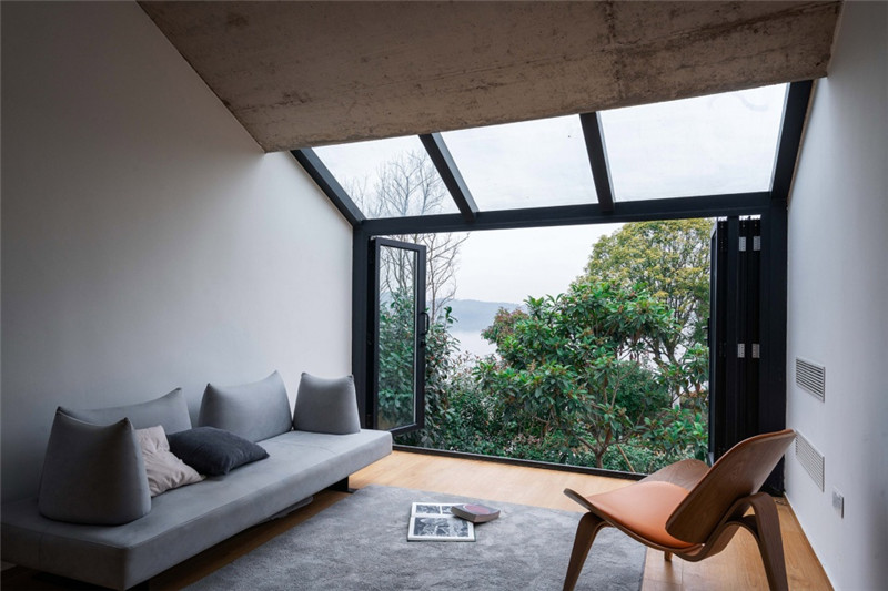 被恭迎進(jìn)門的還有陽光,它們在墻壁上運(yùn)動,留下時間的光斑,引人駐足,凝思。清晨,面向竹林的東窗上灑下安靜的冷光,樹影婆娑清雅;而在下午,沉浸在西側(cè)溫暖的陽光里,使觀湖也變得浪漫。