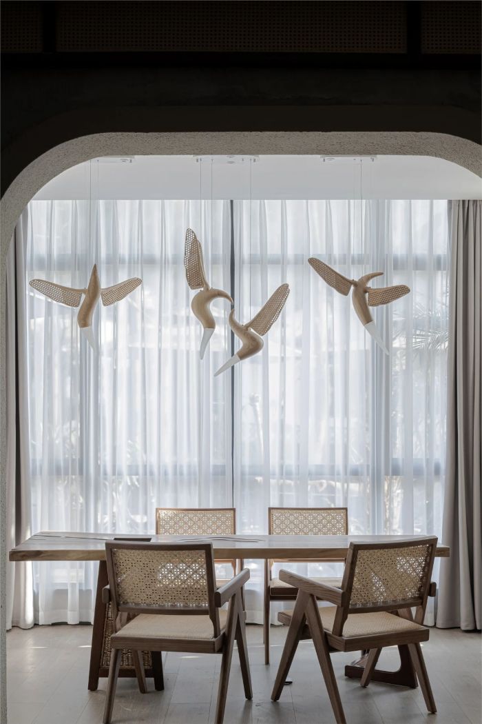以兩種東方美學(xué)色彩為主要線索貫穿和而不同的居室,靜謐自然的原木色調(diào)與水泥漆的紋理墻面遙相呼應(yīng),在日升日落之間雕刻豐富的空間層次;暖色燈光被環(huán)繞的彩線打磨至熹微柔和,于桌椅之間映出深深淺淺的光斑,倒垂的雨后春筍更是生動(dòng)可愛,因設(shè)計(jì)的巧思而意趣盎然。