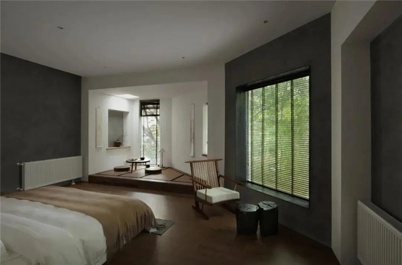 從一層步入二層客房區(qū),透過天窗,可以望向屋外天空。共有9間客房,以武夷山的九種意境命名為“半入云”、“橘隱”等。房間布局因空間變換都不同,但每間客房都保留了玄關(guān)和飲茶空間。天氣好的時(shí)候,倚靠在榻榻米墊上,飲一杯茶打發(fā)愜意時(shí)光。房間朝向周圍樹木,引綠意入室,在城市中也有置身山林的放松。