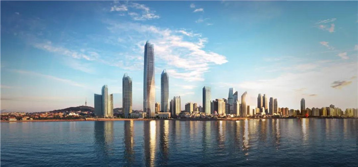在青島瑞吉酒店設計中,海洋元素隨處可見,比如74米高的中庭藝術墻上,有綿長的海岸線和金色沙灘。