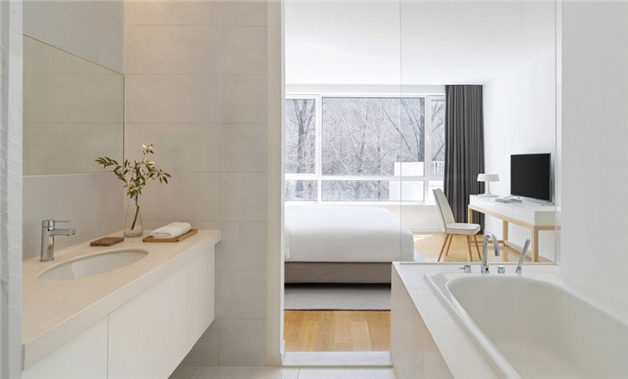 極致簡約定義了室內(nèi)設(shè)計(jì),并加強(qiáng)了建筑與周圍景觀之間的聯(lián)系。每個(gè)客房都由自然紋理的灰泥所覆蓋。房間中唯一折疊并具有不同功能的元素:有時(shí)是床、衣柜或一個(gè)書桌。