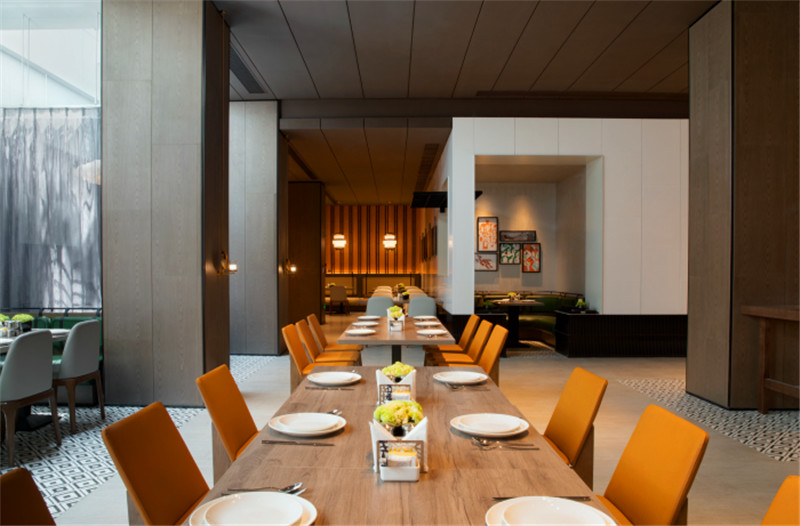 成都青堂酒店設(shè)計因原建筑地下空間封閉黯淡,為解決商業(yè)空間利用率問題,餐廳布置于負一層。將建筑下挖形成采光天井和戶外院落,為餐廳引入自然光線,同時也將陰晴變化的心境引入到空間,陽光進來,雨也下來。