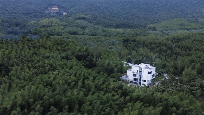 松樓位于江蘇省無錫市,中國的陶都:宜興。周邊自然環(huán)境非常優(yōu)越,處于風景秀麗的陽羨旅游度假區(qū)中的龍池山風景區(qū),不僅在基地四周有郁郁蔥蔥的竹林圍繞,遠眺外圍還能觀賞到群山和農田肌理、山上的禪院,一派山中氣象。民宿建筑通體呈現簡約的白色,通過方盒子的穿插組合、形體上的退讓或出挑,不僅豐富空間類型,獲得更多能夠親近自然的灰空間,又能保持整體純粹的建筑形式。