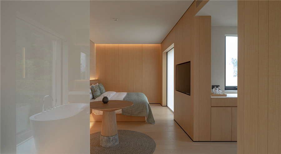 客房內(nèi)無框大玻璃落地窗,摒棄了所有的雜質(zhì),把自然美景毫無保留地引到眼前,設(shè)計師希望能有一種吸引力,把人們從屋內(nèi)吸引到戶外,真真切切地?fù)肀ё匀?,設(shè)計師為無框大玻璃配置了同樣隱形的電動百葉遮光簾,淺細(xì)的木百葉除了遮蔽強烈的陽光外,也猶如竹林般把光影帶入室內(nèi),唯美如斯!