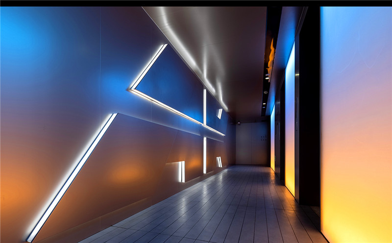 酒店設(shè)計(jì)采用鏡面反射,環(huán)形層疊,吧臺(tái)里的燈光像是流動(dòng)的能量,不斷向上蔓延,與窗外的都市夜景、廟宇輝光相疊,駐足于此,虛幻與真實(shí)逐漸融合。虛幻和真實(shí)交疊的網(wǎng)絡(luò)世界,如同象征未知的黑匣子。表面感官浸染,本源難以探尋。而人類天生就帶著好奇心,越是封閉未知越想步入其中。