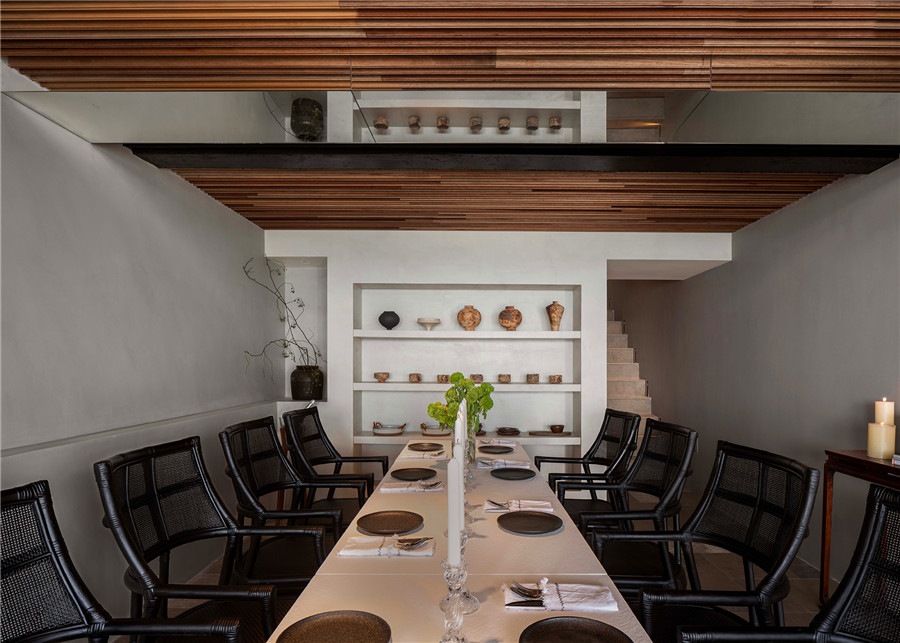 餐廳位于接待區(qū)下方。承接而下的樓梯小徑,帶著點(diǎn)古堡神秘的味道,將人引入一片拙樸而典雅的氛圍。空間以留白為形式主題,通過陶器、木飾天花板和大理石桌的設(shè)置,保留整體的干凈與簡單。一器一物,一茶一飯,生活的動(dòng)人,往往就在于不著痕跡卻又恰到好處的細(xì)節(jié)之中。