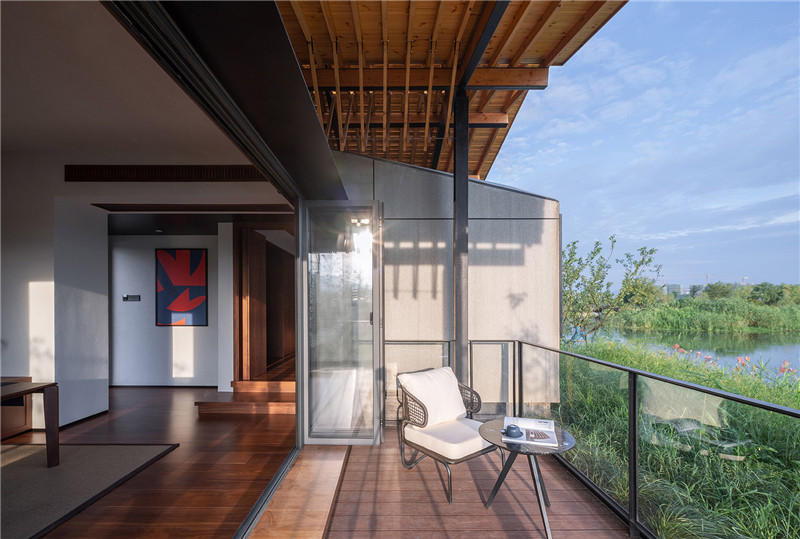 燕屋濕地生態(tài)民宿酒店由兩個客房類型有機打散分布組成,都是運用了在大屋頂下生活的概念,大屋頂也像是翅膀,如小鳥般棲居于此,在島上停留片刻,輕輕落在水面上。古人造物很喜歡因地制宜,輕巧的介入自然,用木頭把房子架在水上,房子被自然融入與包裹,這種生態(tài)觀念在中國人的骨子里就一直存在。