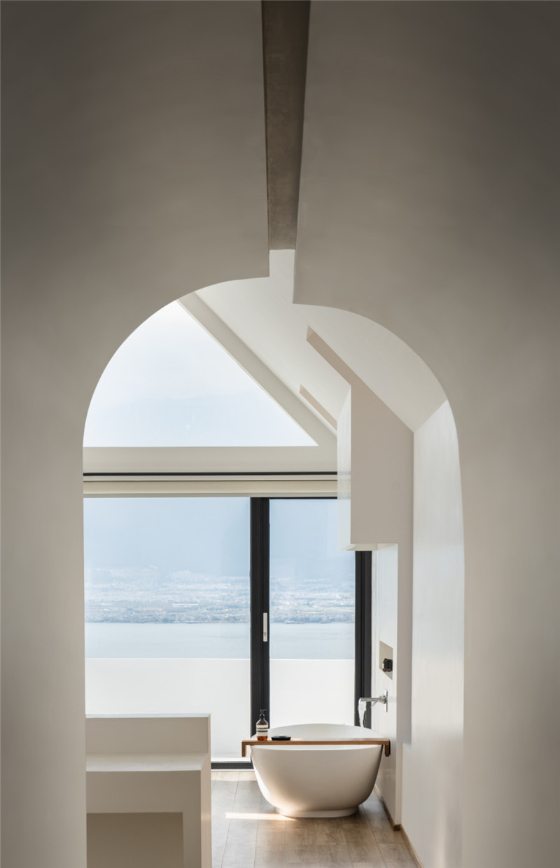 酒店只有7間客房,采用景觀露臺(tái)-景觀浴缸-臥室-洗手間的縱深式布局,將蒼山洱海巧妙地“引入”建筑內(nèi)部。在窗戶的處理上,民宿設(shè)計(jì)師摒棄了大理很多大面積落地窗的做法,采用水平長(zhǎng)窗的設(shè)計(jì)手法。這樣的做法,限制了窗戶露出的尺度,遮擋多余視線,反而賦予窗外風(fēng)景更多的力量。
