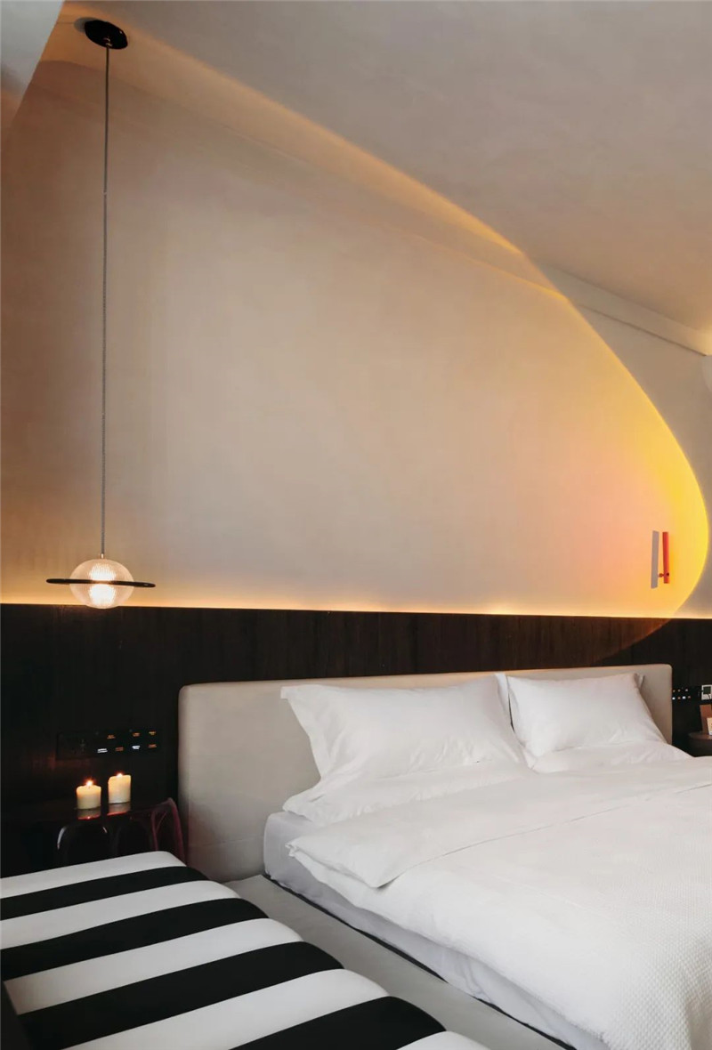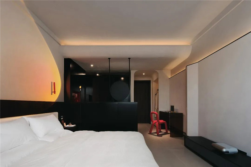 空間里用解構(gòu)思維來表達舒張,將曲線和塊面凸出或交織,通過色彩和燈光關(guān)系的引導(dǎo),使得空間與材質(zhì)的過渡變得有序且自然。平入仄出的隱喻細節(jié),柔化了空間的界限,點線面結(jié)合燈光的組成構(gòu)建,打造視覺亮點又兼顧整體畫面。