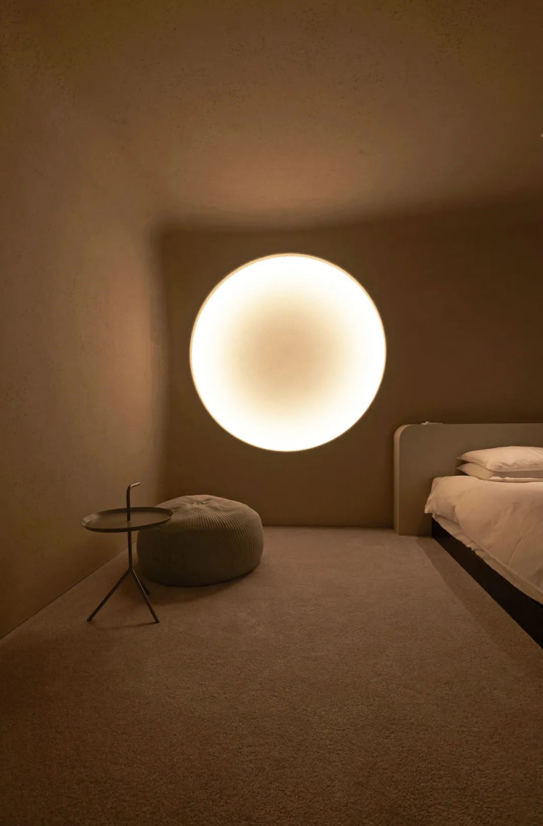該房間只有一扇面向庭院的窄窗,因此Kubo Tsushima Architects設(shè)計了一個特殊的圓形照明裝置,能夠通過人工設(shè)計呈現(xiàn)出從新月到滿月的時間變化,適應(yīng)不同時段對光線的需求。另外其利用灰泥將客房的墻角調(diào)整為順滑的圓弧,結(jié)合燈光營造出溫暖的客房氛圍。