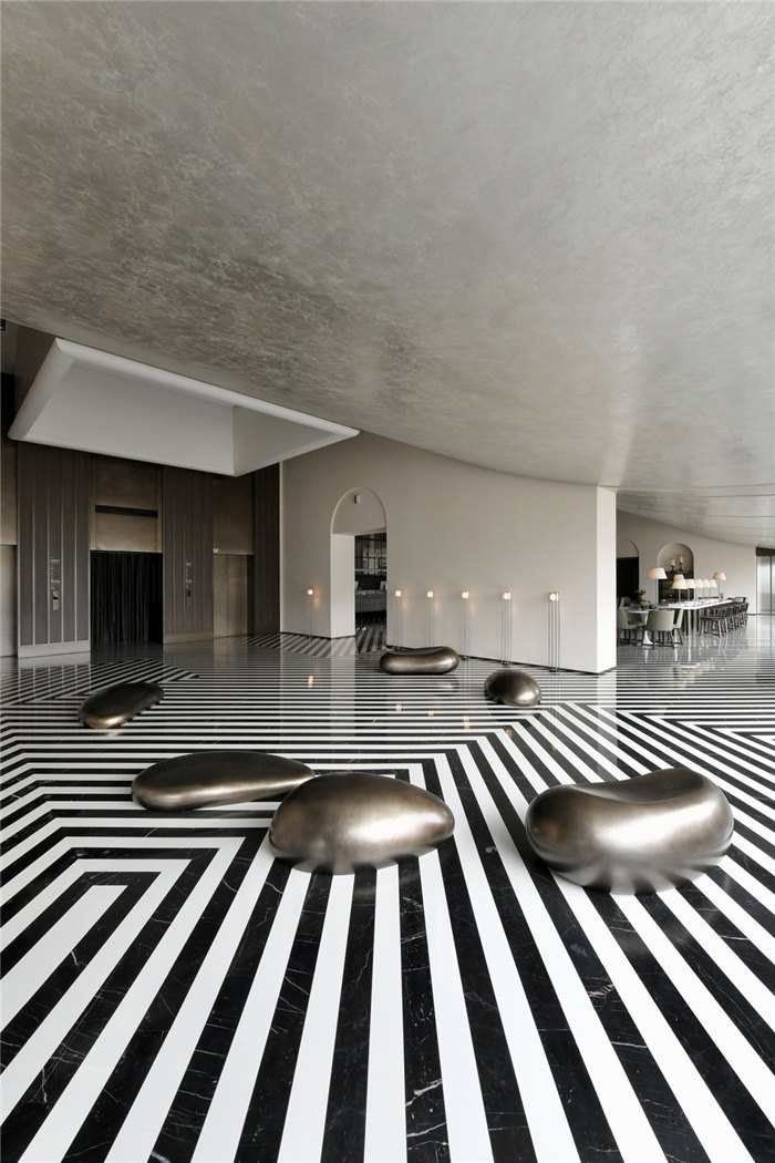 圓拱門洞的設(shè)計,呼應(yīng)頂面的弧形線條,使視覺感受更顯柔和圓潤,結(jié)合大堂的米白色素凈立面,流暢舒展的動線布局,舒適柔軟的家具陳設(shè),共同營造空間質(zhì)樸的精致感。
