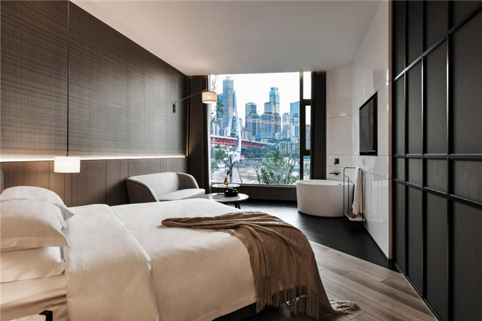窗外江起云涌,渡輪穿梭,在光的廊道中流連往返,于光影和細(xì)節(jié)處體驗場域的微妙和精細(xì)??臻g設(shè)計營造東方雅致與現(xiàn)代簡約的相逢純粹質(zhì)感,融合物件、景觀與光影,創(chuàng)造悠閑自在的度假氛圍,全心詮釋引人入勝的山城奢享旅居體驗。