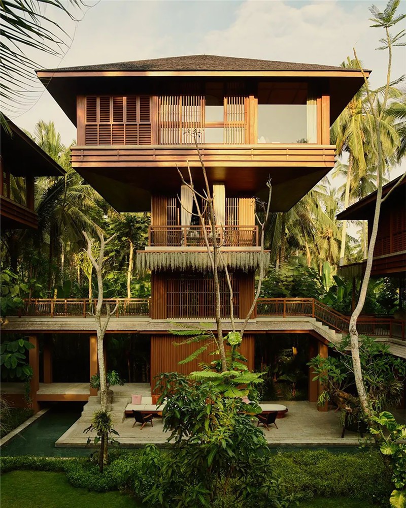 建筑設(shè)計(jì)采用巴厘島熱帶雨林設(shè)計(jì)風(fēng)格與樹屋相融合的形式,獨(dú)特的外觀設(shè)計(jì)表達(dá)雙重的度假詩(shī)意,給人更愜意、更徹底的心靈治愈般的體驗(yàn)。在神秘的叢林中打造與視覺相悖的書屋塔樓,漂浮叢林里,指向大海。