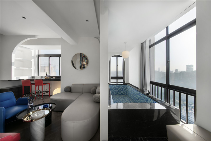 這處物業(yè)最打動設(shè)計師溫浙平的地方,正是詩意般凌空于解放碑百米高空的屋頂大露臺。盡管當(dāng)初購置該房產(chǎn)花費1700萬,裝修耗時近2年,花費將近600萬。但這里幾乎每個角度都能得見山城景色的撩人視野,之于酒店設(shè)計師來說無疑是種巨大的誘惑,這也為酒店后續(xù)策劃和空間設(shè)計創(chuàng)造了更多可能性!