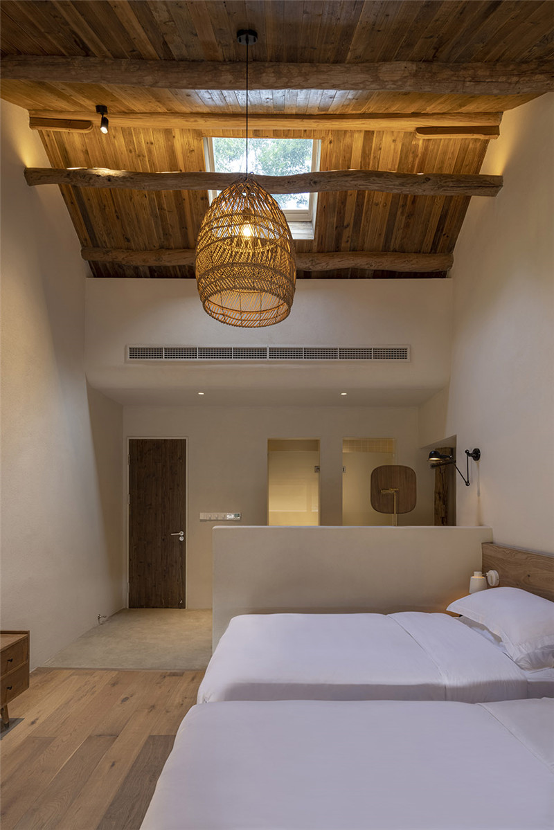 老房子的右側(cè)原本有間用來存放農(nóng)具的柴房,在改造中與客廳打通,變?yōu)橐婚g格外隱秘的客房。二樓設(shè)置了三間客房,房內(nèi)均以榻的形式呈現(xiàn),無論大床、標(biāo)間或是加床統(tǒng)統(tǒng)得以滿足。