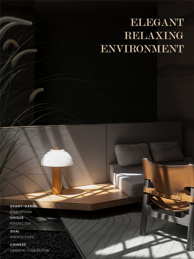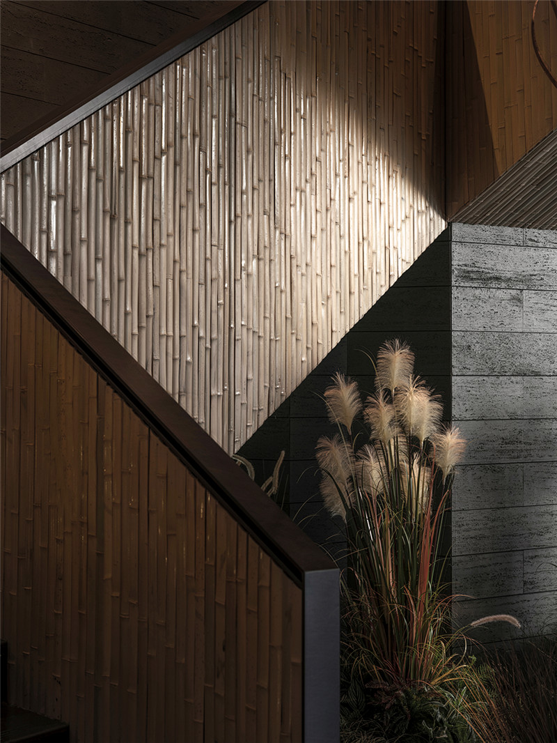利用極簡的形體包裹細(xì)膩的細(xì)節(jié),為空間營造東方氛圍的儀式感。明麗沉靜的湖泊,繁茂迷離的蘆葦,繾綣輕柔的夢般的輕煙碧波。綠蔭竹林,蘆葦依依,順著幽靜閑適的小徑,一路捕捉若有若無的草葉馨香,光影交織。