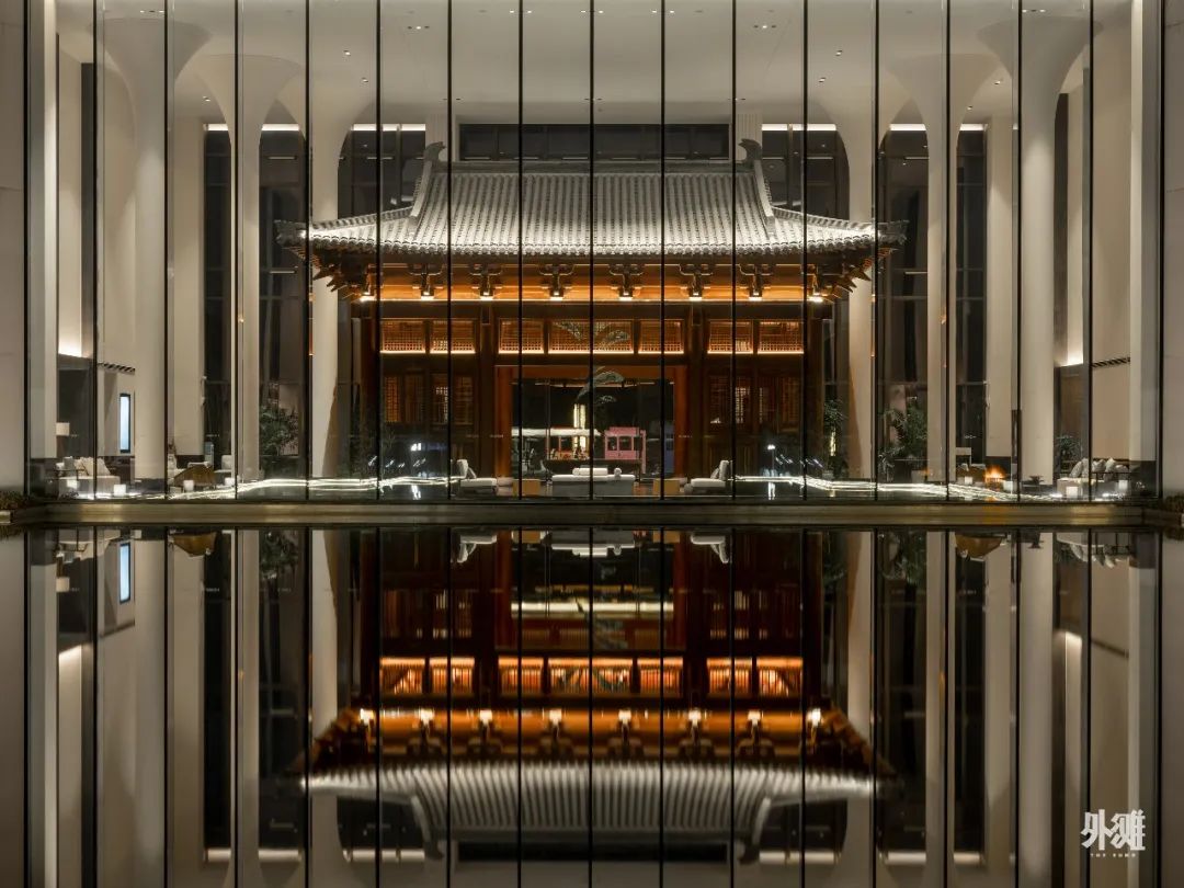 同時,大堂與鏡面水池、無邊泳池、湖景構(gòu)成三水一堂的中軸線設(shè)計,可以窺得不遠(yuǎn)處的山水景致。正中的透明盒子、向外延伸的連廊,無論從哪個角度看去,都通過鏡面水池將對稱的美學(xué)發(fā)揮到極致。無怪乎梁思成曾說:“再沒有一個民族對中軸對稱線如此鐘愛與恪守?!?/p>