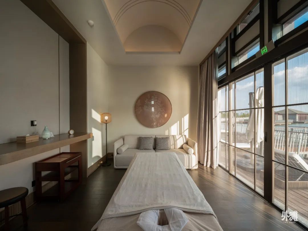 屋頂則采用了古建筑中常見的人字頂,相比一樓的客房挑高更高,也讓室內(nèi)更通透。部分墻面以竹編造就,體現(xiàn)了酒店里無處不在的在地文化。大片木色與淺色家具將山水養(yǎng)修融合,既有空間意境之美,也不失居家般溫馨愜意??头窟x品依舊是悅榕的高標(biāo)準(zhǔn)。備品選用鴻居定制系列,KA的浴缸讓泡澡變成一件享樂的事。