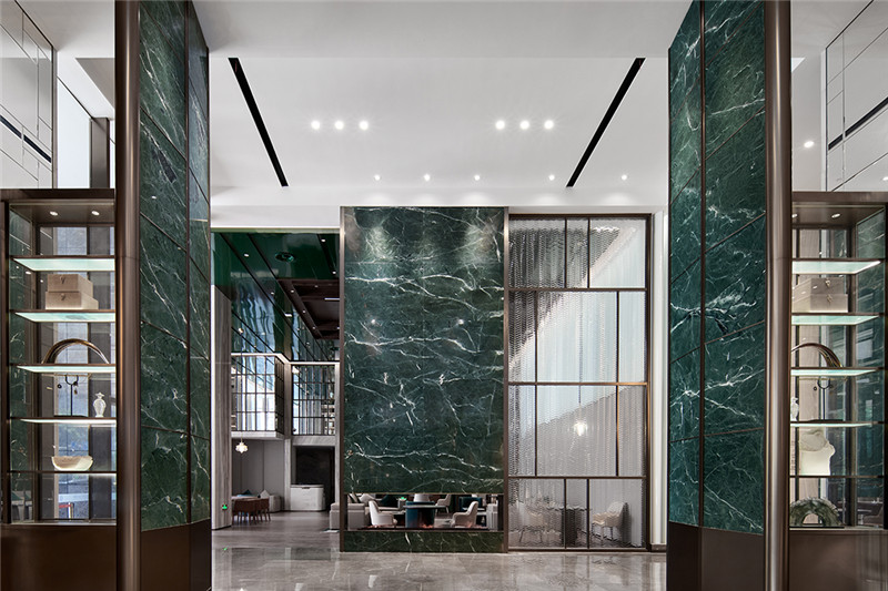 衍生到空間的色彩配置,滿目翠綠,自天花為始,隨著結構的起--勢一路蔓延而來,考究的線條排布強調細膩的空間體驗。相同的色值在不同的材質中以獨有的層次質感紛紛登場。通過空間意會的傳達,山林風光被分解成零散的描述,設計師將綠與暗銅色的金屬相配,如枝葉錯落,層層疊疊,與來人共赴一場如墜山林的深入體驗。