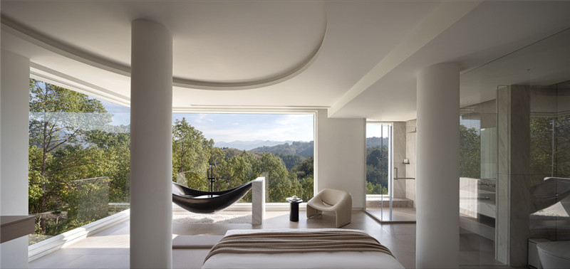 縱觀酒店被山林所包圍得天獨(dú)厚的地理環(huán)境,設(shè)計(jì)師在建筑上用白色涂料包裹,像是一個(gè)米白色樹窩,在林間描繪出明暗的邊界,打造出一片屹立于山間的別樣風(fēng)景。從遠(yuǎn)處望去,酒店隱隱地透過樹林被看見,與城市的熙攘隔絕,像是一片隱藏的白色樹窩。