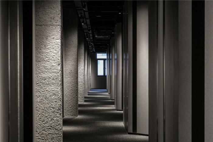 在營造大尺度與力量感的同時,于粗糲的混凝土柱縫隙中精心植入綠色苔蘚,以展現(xiàn)生命與自然的不可或缺性和平衡作用。設(shè)計師從云南收集回來的老木頭,被設(shè)計為共享辦公的長桌,在硬朗的工業(yè)格調(diào)下體現(xiàn)人文溫度。光亦是柔軟空間氛圍的重要筆觸,倒掛著的吊燈,猶如昔日熱火朝天的工廠里來回忙碌著的運輸車,燈光傾瀉在桌面上傳達的靜謐與舒緩,將老羅湖曾經(jīng)熱火朝天的繁華場景悉數(shù)娓娓道來。