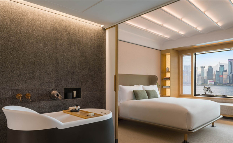 設(shè)計(jì)師盧志榮也參與了外墻材料的選擇,以及在面向水的一側(cè)引入枯山水和具有一定反射功能的天花板,同時(shí)還更新了門廊和入口設(shè)計(jì)。設(shè)計(jì)師說(shuō):“沒(méi)有特殊視角的美景只是任何人都可以購(gòu)買的明信片;因此,框景的多種演繹是客房的設(shè)計(jì)重點(diǎn)。浴室是一個(gè)感官的避難所,將沐浴體驗(yàn)重新定義為一種藝術(shù)形式。”設(shè)計(jì)為客房營(yíng)造了靜謐的居住環(huán)境,通過(guò)減少墻面打造開(kāi)放式布局。在海景客房中,滑動(dòng)門敞開(kāi),露出弧形的獨(dú)立浸泡浴缸,展現(xiàn)壯觀的海港景色。