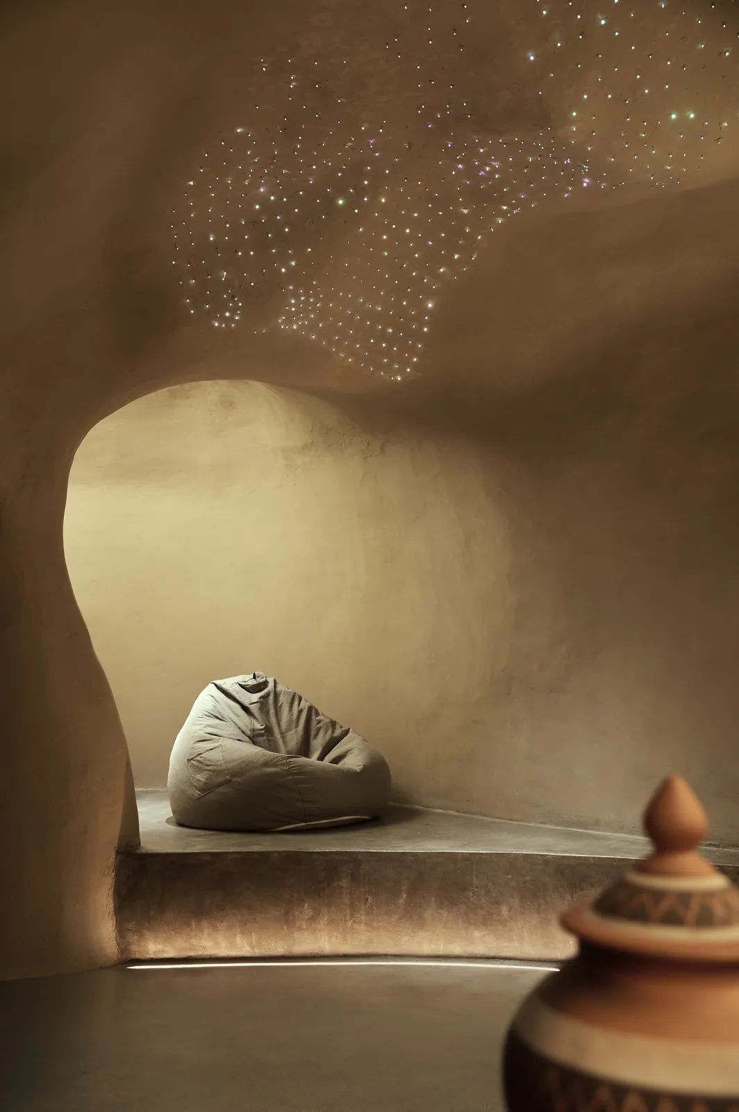 小乘佛法有曰:“諸行無常,諸法無我,涅盤寂靜?!痹O(shè)計師把當(dāng)?shù)囟U學(xué)思維影響下的裸感美學(xué)植入到設(shè)計風(fēng)格中,以純粹的質(zhì)感引領(lǐng)人們放空身心,在雨林溶洞中找回那一份靜謐安然。沿著星空的軌跡逐步深入空間,以自然之手筑起蜿蜒起伏的墻面,溫柔的色澤仿若投入大地的懷抱中,倍具安全感,原始的氣息正在喚醒內(nèi)心對自然的渴望。