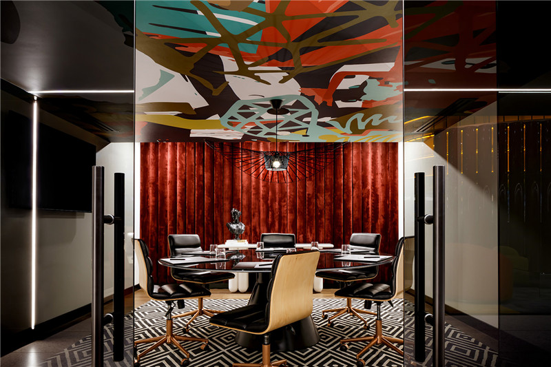 位于二樓的接待區(qū),也被稱為客廳,這里是W品牌的標(biāo)志性空間。它被規(guī)劃在一個(gè)玻璃立方體中,宛如一方城市綠洲,帶領(lǐng)人們遠(yuǎn)離城市的喧囂,同時(shí)又讓人們與當(dāng)?shù)氐奈幕c背景保持聯(lián)系。對(duì)比鮮明的色彩與材質(zhì)創(chuàng)造出舒適的氛圍,隨著冬雪的到來,這種溫暖與舒適的感覺將會(huì)愈加明顯。在客廳里,懸掛的網(wǎng)格、天鵝絨窗簾,以及如同電影放映機(jī)般的燈光營造出一種后臺(tái)的感覺,讓人不禁聯(lián)想到劇院,而家具與藝術(shù)品陳設(shè)則進(jìn)一步強(qiáng)調(diào)出這種場(chǎng)景感,并在不斷變化的場(chǎng)景中為有限空間創(chuàng)造出動(dòng)態(tài)的氛圍??蛷d的設(shè)計(jì)旨在向多倫多蓬勃發(fā)展的戲劇和電影文化致敬。