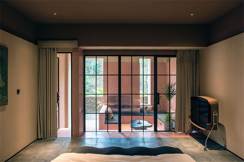 在一層,客房與庭院的邊界,被放大為一組灰空間;結合自內二外下降的地勢,置入一組嵌入地面與臺階整合的紅色水磨石體量;在標準客房,這一體量構成的下沉空間成為圍坐的茶飲休閑場景。有頂無窗的灰空間為南方溫熱氣候中的建筑提供了舒適怡人的半戶外休憩場所;在家庭套房,灰空間橫向展開,在立面較封閉一側,地面高低進退構成一套供兒童嬉戲玩耍的場所;在開敞一側,紅色體量向景觀伸展,并形成一個面向山野的無邊泳池。