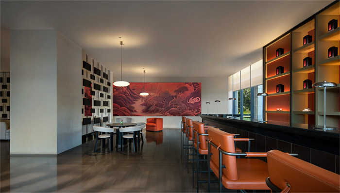現(xiàn)代人在奇幻瑰麗的神話和詩(shī)篇中讀到楚地浪漫及神秘的幻想,那些嵌在文字與泥土之間寂靜的裂縫,它們遲來(lái)的回音在許多年之后將我們自睡夢(mèng)中擰醒。大堂吧以禮樂(lè)空間為主題,通過(guò)色彩有秩序的量的對(duì)比,沖突及互補(bǔ)來(lái)達(dá)到美的大同,融合曾侯乙編鐘的內(nèi)在序列感和空間節(jié)奏感,從而衍生時(shí)間與空間的廣闊性。