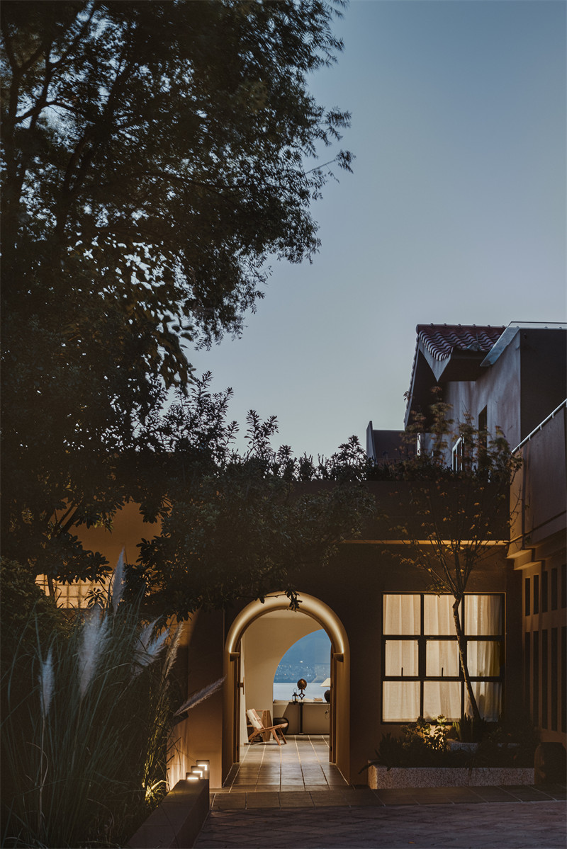 “晚霽”臨海,藏于海東邊花園一角,其理念讓民宿回歸本源。設(shè)計(jì)師希冀使生活回歸情感,將自然引入設(shè)計(jì)。夜半時分,水波中樹影和月亮的殘片深情地注視著一旁安靜的建筑。四季場景更迭,它巋然不動,悄無聲息地融入自然,唯陽光透過樹枝絲絲縷縷地垂落素墻,忽高忽低、時隱時現(xiàn),讓人感知時間流轉(zhuǎn)。