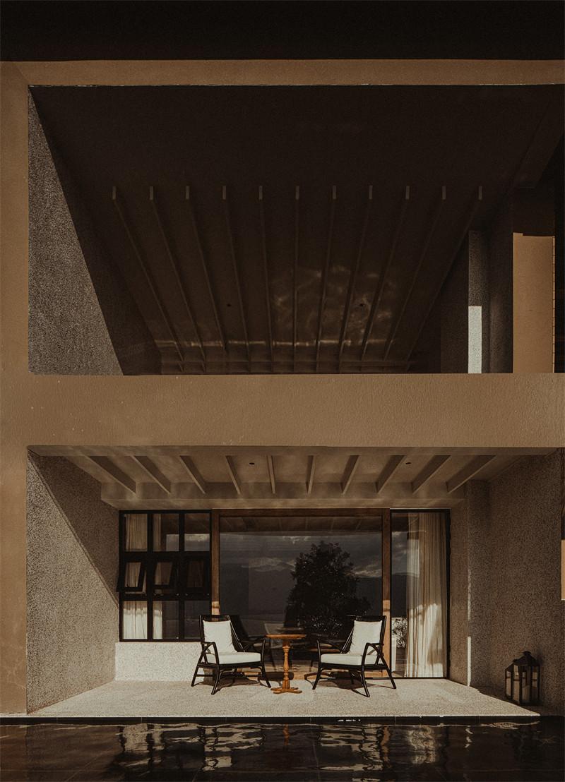 光影與空間相生相持,浮光掠影,行皆有境,時空漸生。光,賦予空間以生命和靈魂,勾勒著建筑的邊界與線條。設(shè)計(jì)師突破空間的圍墻,將自然山水“裝裱”給空間。清晨醒來,從水景看臺望出,太陽穿透薄霧,光灑落整個湖面。水景看臺的設(shè)計(jì),遮擋住了多余的視線,將空間外之景物納入內(nèi)部視線范圍中,延伸空間的深度與廣度,將水景與洱海連成一片,協(xié)調(diào)相融,虛實(shí)相生,盡感空靈、溫柔、自在的基調(diào)。